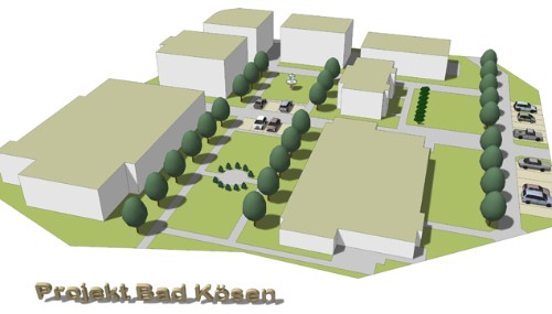 Vorentwurf für Wohn- und Betreuungsangebote für Senioren in der Stadt Bad Kösen. Das 10 ha große Gelände soll eine Mischbebauung mit unterschiedlichen Wohngruppen und flexibler Bauweise aufweisen (2011).
